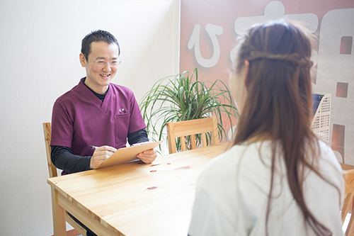 その日の施術内容の説明をし、患者様自身にご自分の身体の状態を理解していただくことで、日々のセルフケアをしっかりと行って頂きます。次回の施術ポイントや生活のなかで気を付けて欲しいところなどをお伝えします。